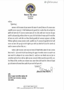 ग्वालियर में कुलपति की जान बचाने न्यायधीश की कार छीनकर इलाज कराने के मामले में लिखा पत्र।